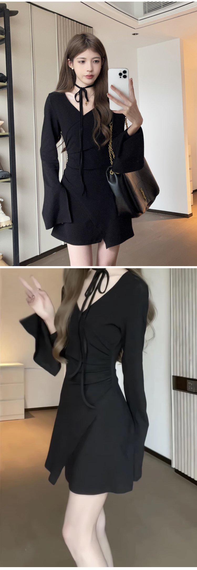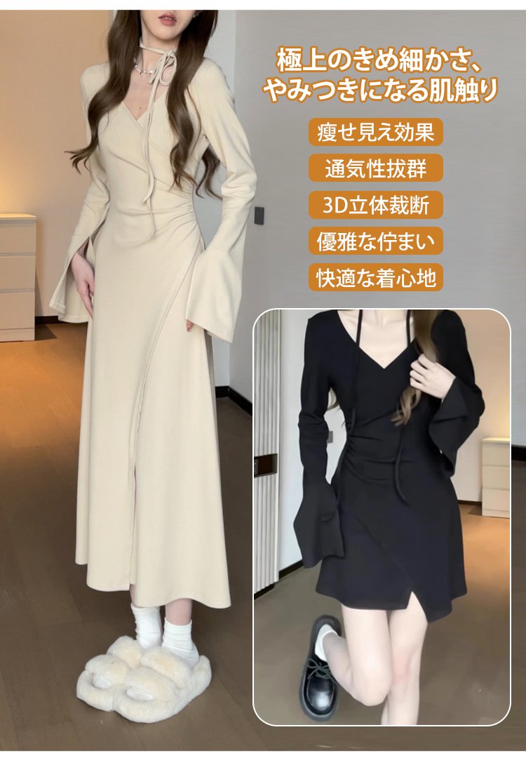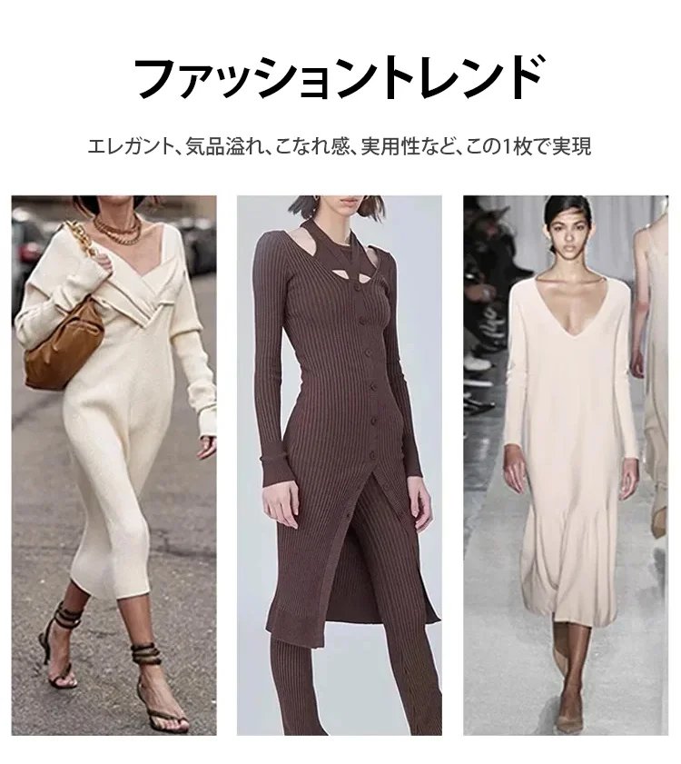 Vネック長袖ロングカシミヤニットワンピース